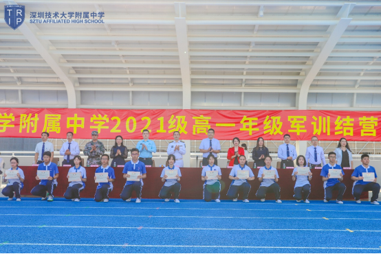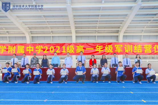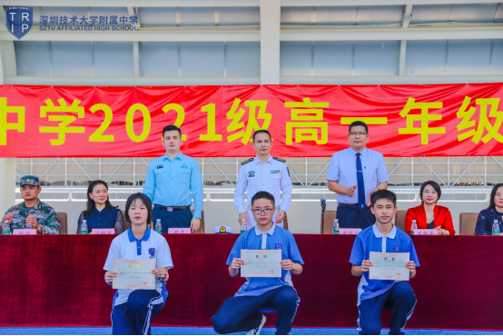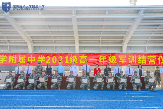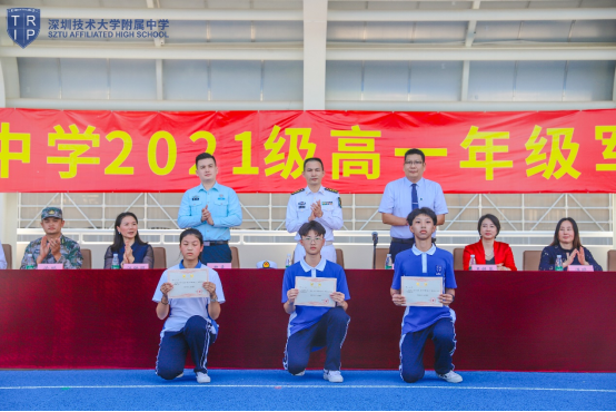 在接下来的表彰仪式中,主席台上的领导们为在本次军训中分别荣获“深技大附中军事训练优秀内务奖”、“深技大附中军训标兵”和“深技大附中优秀军训总结”的学生代表颁奖,并为荣获“深技大附中军事训练优秀教官”的13位教官进行表彰。紧接着,夏部长、田校长以及魏科长为分别荣获“深技大附中军事训练优秀队列奖”和 “深技大附中军事训练先进集体”的班级代表颁奖。