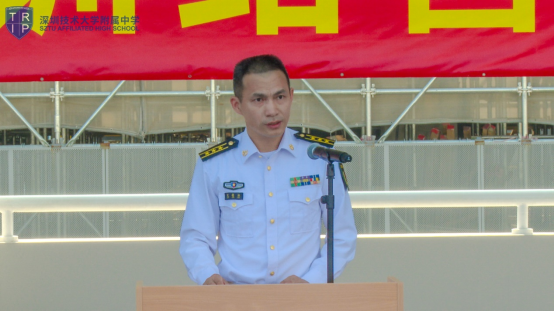 随后,坪山区人武部部长夏遵初发表了精彩讲话和殷切寄语。夏部长指出,军训是高中生活的必修课,是人生中一段难忘的经历。它可以透过多种形式,增强同学们的爱国情操,强化同学们的国防意识,培养吃苦耐劳精神,塑造良好行为习惯,提高遵守纪律的自觉性。他对同学们提出了几点要求:希望同学们以军训为起点,把军训中养成的军人作风保持下去,带到今后的学习和生活中,高标准、严要求,规范自己的言行;发扬部队的优良传统和作风,严于律己;珍惜这次军训经历,铭记所学到的知识和做人的道理,珍惜青春时光,努力拼博、奋发进取;增强团队意识和集体观念,同学间互相帮助、团结友爱,力争在新的起跑线上大家整齐步伐,打好全面进步的基础。