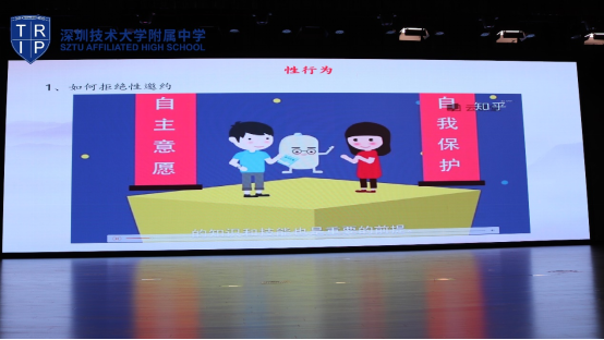 首先,匡老师从生理和心理的角度讲述了青春期女生经历的变化,耐心细致地向大家传授卫生保健知识,并告诉同学们在青春期如何呵护自己的身体和心理健康,帮助大家正确认识自我、悦纳自我。随后,匡老师由“为什么青春期的孩子喜欢与异性同学在一起?”的提问引出青春期异性交往的话题,引导学生如何客观看待与异性的关系,正确把握与异性同伴相处的界限和原则,掌握青春期心理调适的方法和途径。接着,在“自我保护”部分,匡老师结合现实案例和视频演示,就性骚扰、性侵害等现象的预防和自我防卫技巧展开了叙述,并给同学们提出了切实可行的建议,帮助同学们树立良好的自我保护和法律意识,健康文明的性观念和性道德。在讲座最后,匡老师以“了解自我,珍爱自我”八字寄语在场的每位女生。