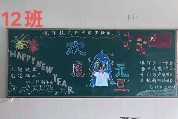 日月开新元,万象始更新。为迎接2022年元旦佳节的到来,强化文化育人的作用,进一步推进校园文化的建设,彰显校园文化的魅力,营造班级文化氛围,培养学生的动手能力和创新意识,深圳技术大学附属中学于近日举办了一场题为“辞旧迎新,喜迎元旦”的班级黑板报展评比赛。