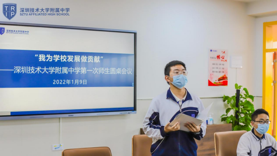 学生是学校的主体,是每一位教师最为关心、牵挂的存在。学生关心的事就是学校最大的事,学生的幸福感就是教师工作的成就感。作为学校的主人翁,学生有权利、有义务、有热情、更有能力参与到学校的建设与维护当中。秉承这个理念,深圳技术大学附属中学于2022年1月9日在206会议室召开师生圆桌会议,田祚鹏校长带领学校行政领导与学生会主席团、各部部长、学生俱乐部部长代表、各班班长和团支书等30人共商学校建设。会议由学生处主任邓怀涛主持。