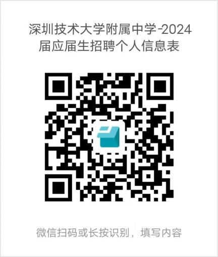 符合招聘条件且有意向的应聘者请将报名材料做成一个PDF文件发送至我校招聘邮箱sjdfz@139.com,邮箱标题及文件命名格式为:报名岗位+毕业院校+姓名(例:高中语文岗位-XX大学-李XX)。并扫描下方二维码同步填写报名信息:
